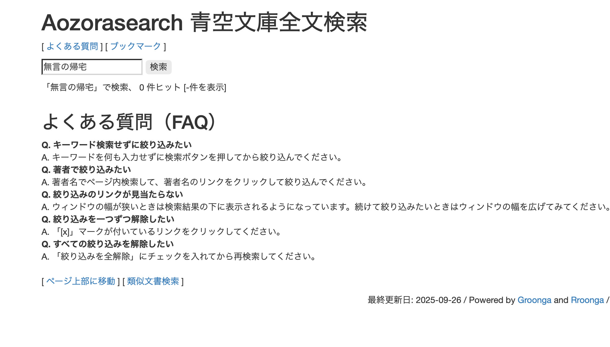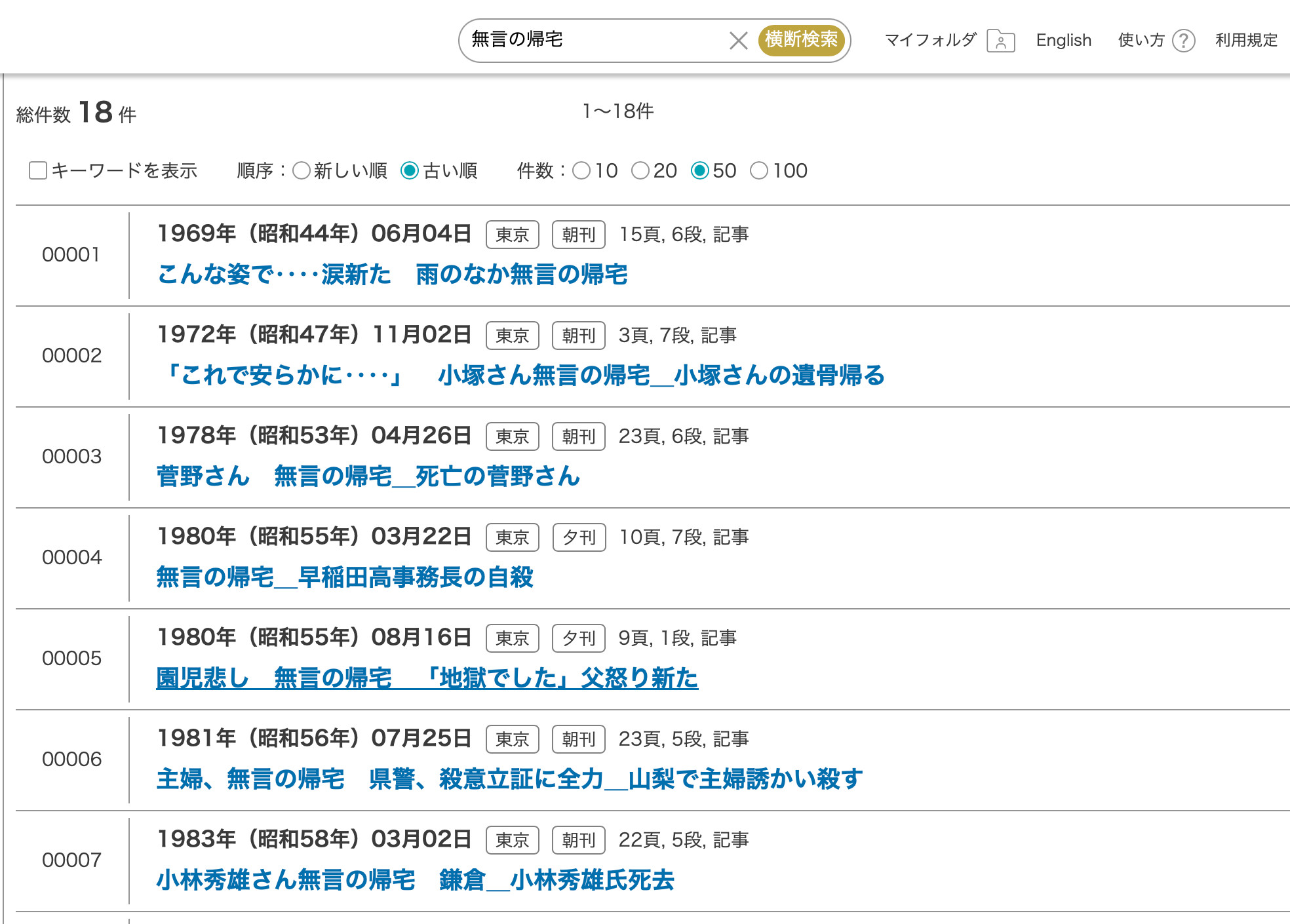 「無言の帰宅」という表現は、国立国語研究所のコーパスを検索してもほとんどヒットしません。2000年代に2件だけ。青空文庫にも登場せず、新聞データベースでようやく1969年に遡れる程度。 つまりこれは、一般的な語彙というよりも、かなり特殊なレジスターで使われている表現だと考えられます。接する機会がなければ、そもそも“ひとまとまりの表現”として知らないのは当然でしょう。