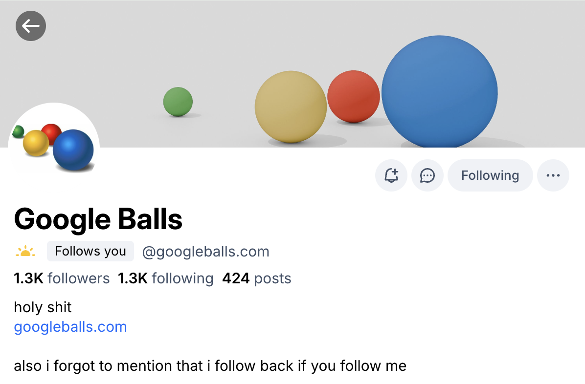 In January 2025, a mysterious account called "Google Balls" went viral across English-speaking Bluesky. It's a joke site where the four colored circles of the Google logo bounce around. That's it. Yet within hours, it surpassed 1,000 followers, spawning an explosion of fan art, VRChat worlds, and game mods.