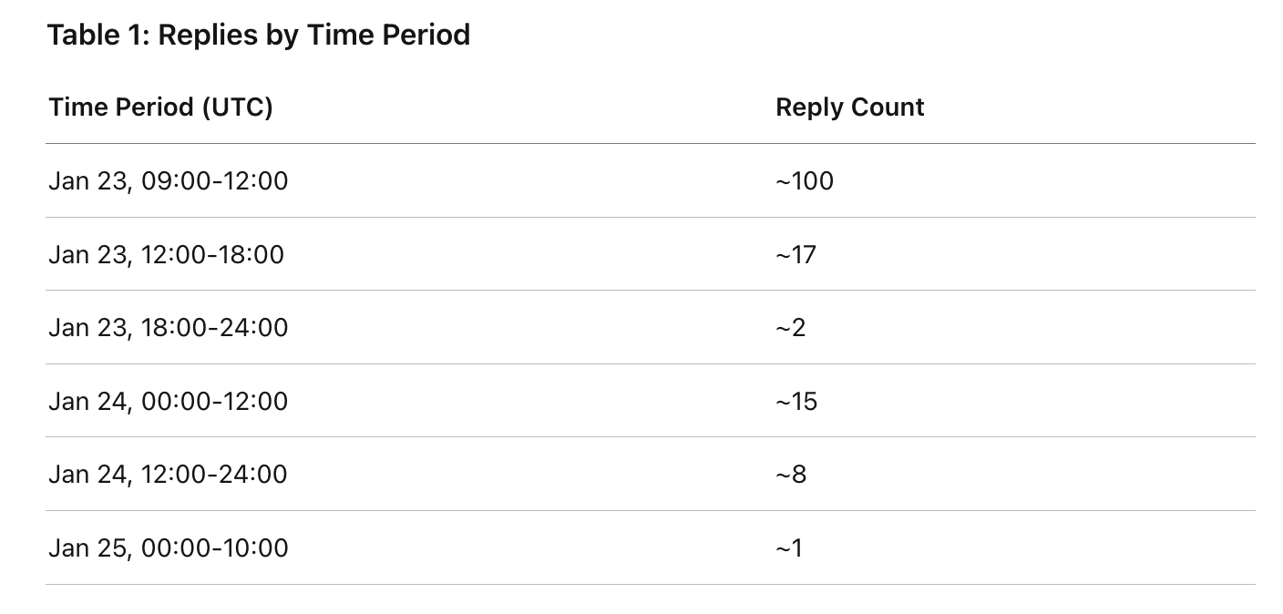 Note: The original post mistakenly stated "January 24" instead of "January 23," corrected immediately after posting. This correction post is included in the 143 replies.