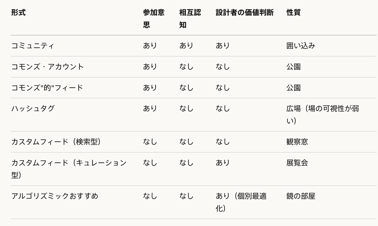 フィードとコミュニティの違いを、参加意思、相互認知、設計者の価値判断という3つの軸で整理する。