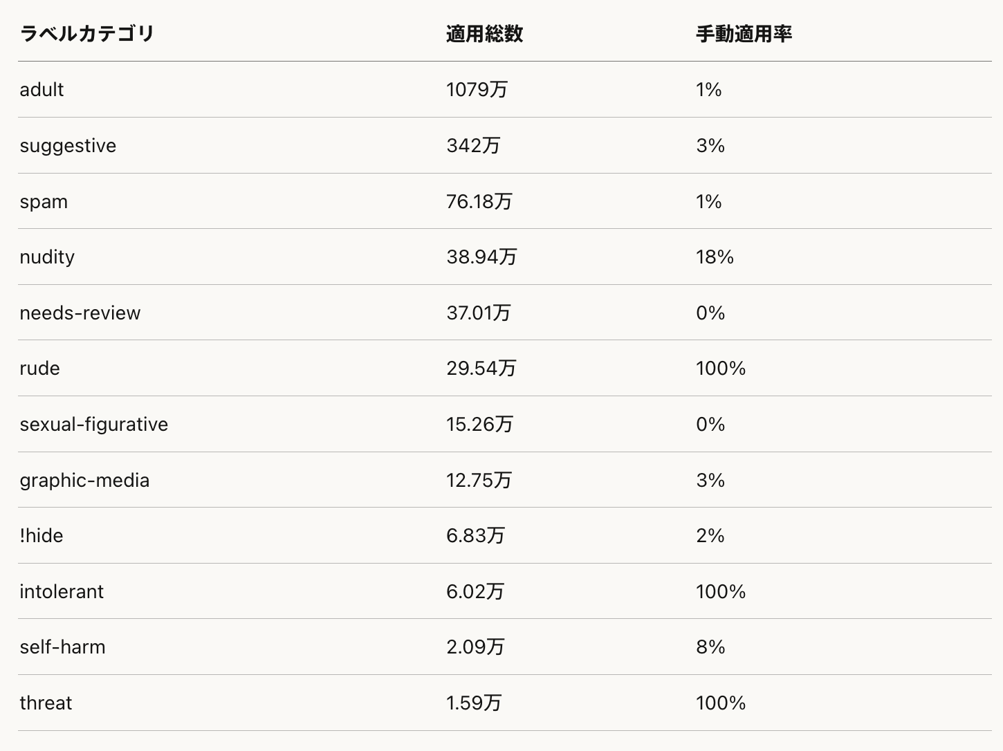 rude(29.54万件)が人的モデレーション作業量の最大部分を占める。intolerant(6.02万件)とthreat(1.59万件)はすべて人的レビューを経ている。