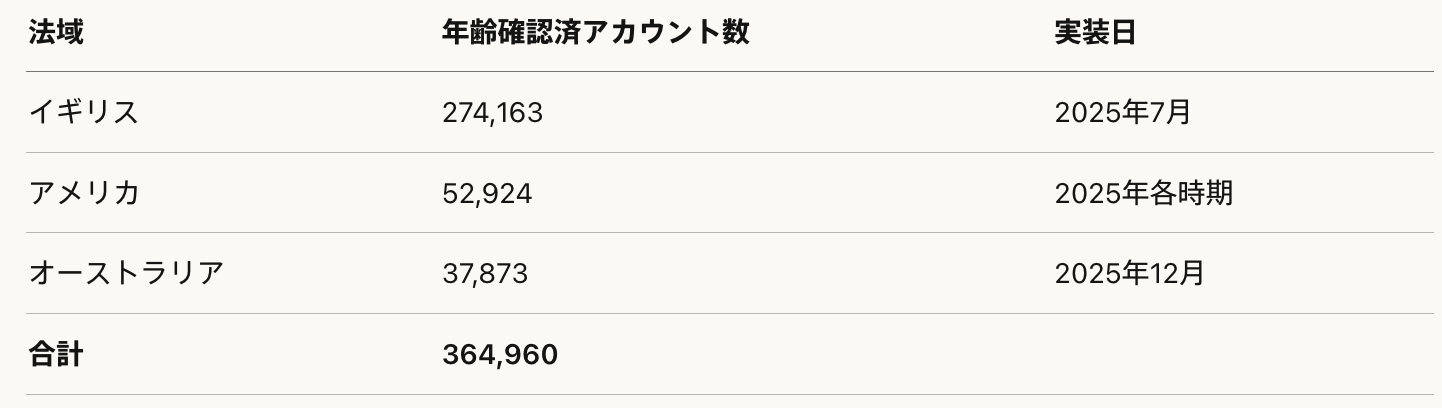 年齢確認の実装対象法域はイギリス、アメリカ、オーストラリアの3か国のみで、日本は含まれていない。