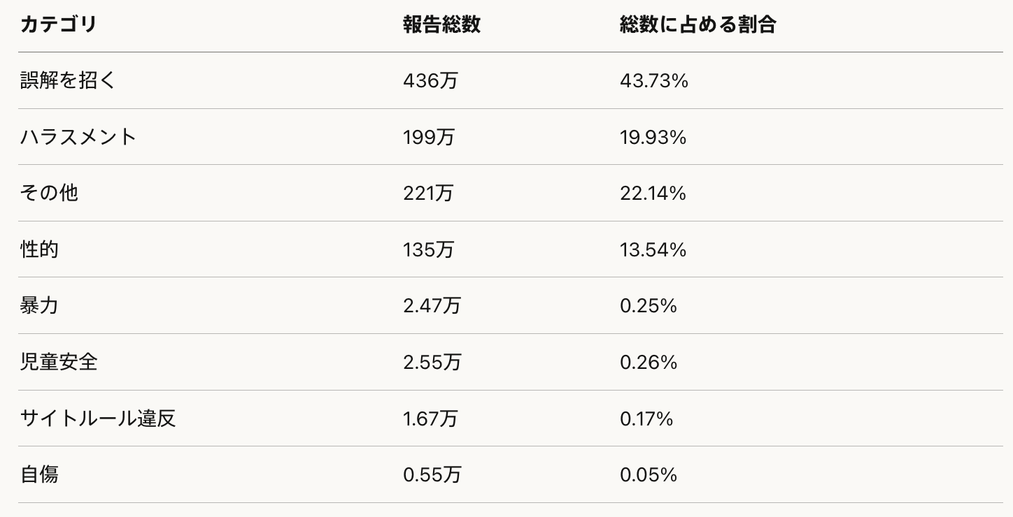 2025年、ユーザーは997万件の報告を提出した(2024年の648万件から54%増加)。この増加は同期間の57%のユーザー成長とほぼ一致している。報告は124万人のユーザーから寄せられ、ユーザーベースの約3%が懸念のあるコンテンツにフラグを立てた。